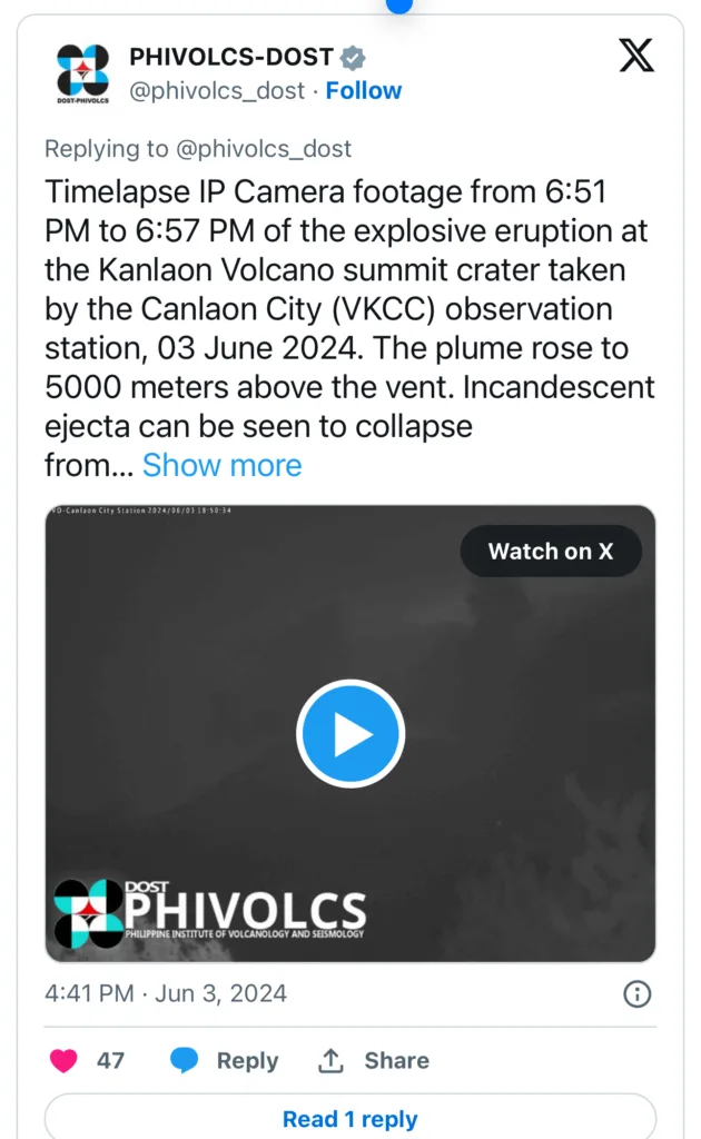 The country’s Philippine Institute of Volcanology and Seismology (PHIVOLCS) posted an increase to its alert level on X, warning of further “explosive eruptions”.