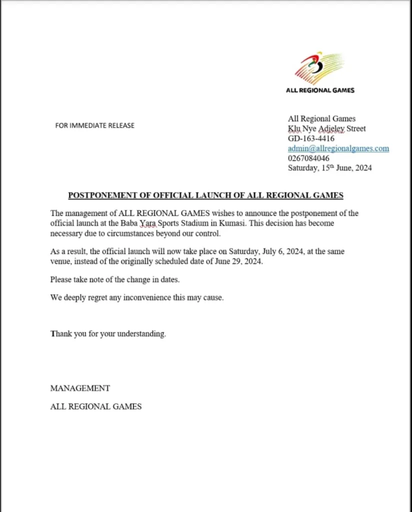 The date for the official launch of the ALL REGIONAL GAMES 2024 which was scheduled for Saturday 29th of June 2024 has been postponed to Saturday 6th July 2024.