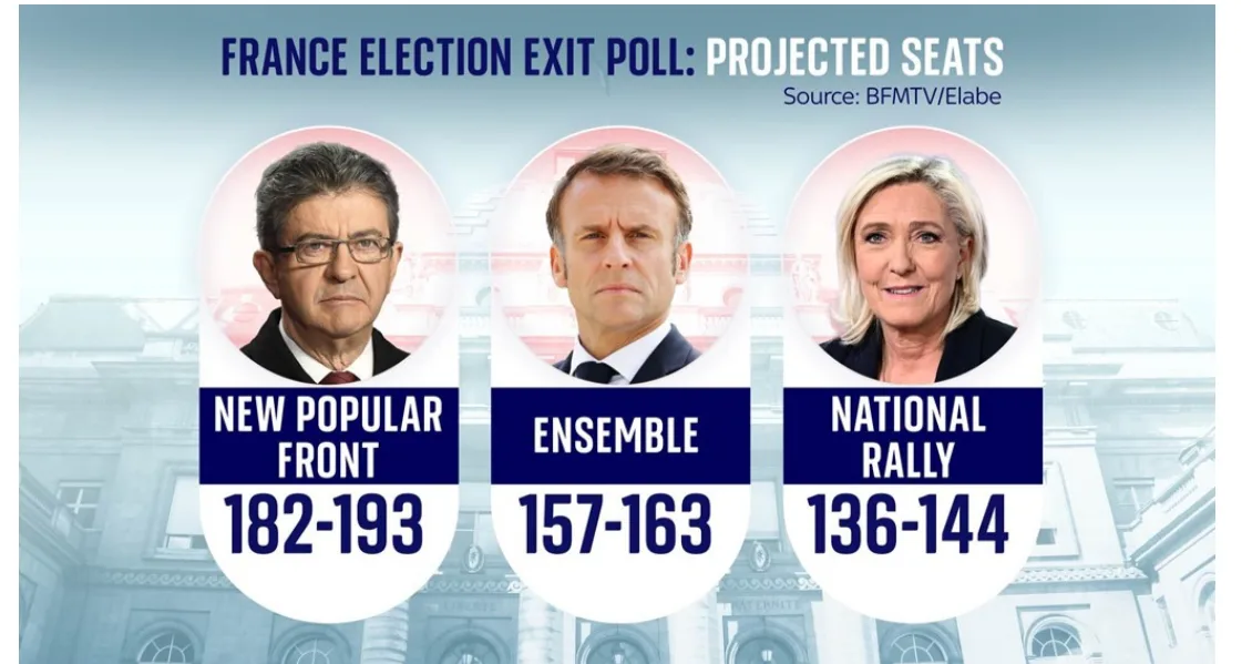 “The biggest, but well short of an absolute majority, will be a left-wing coalition called the New Popular Front.