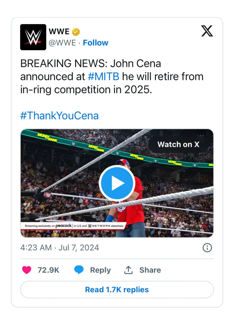 The star’s announcement was met by a cheering crowd who went on to chant “Thank you Cena”.