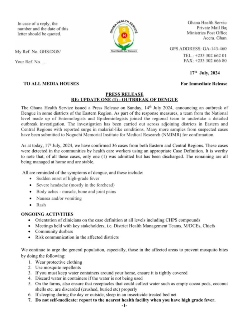 The Ghana Health Service (GHS) has confirmed 36 cases of Dengue Fever in the Eastern and Central regions.
