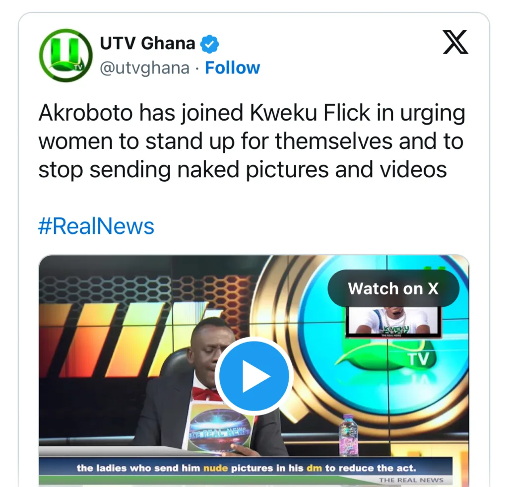 “Kweku Flick is advising women to stop sending their naked pictures to him. Where are we taking the world to? If you send your nude pictures to me and I develop an interest in you, I will tell you bluntly that you are not suitable for marriage, although I might have fun with you. No serious man will marry such a person because you could send your nude pictures to another man too,”he said in Twi.