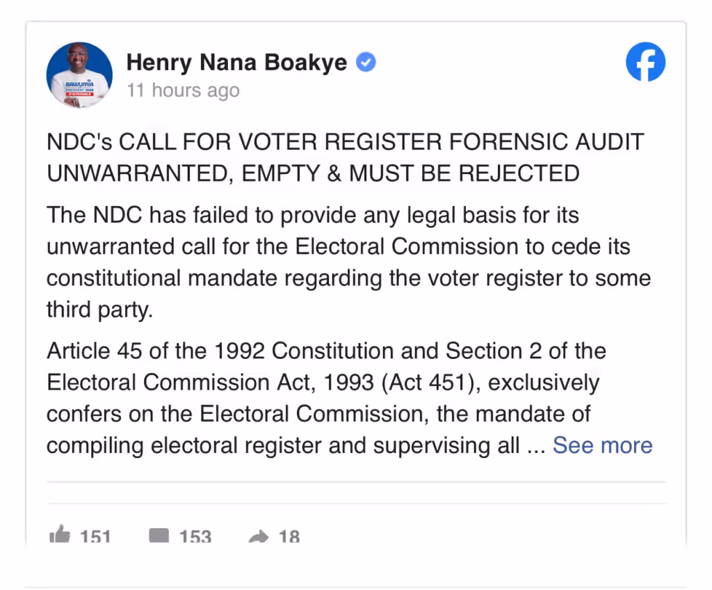 In a Facebook post on Tuesday, Nana Boakye emphasised that the NDC has failed to provide any legal basis for its demand that the Electoral Commission (EC) cede its constitutional mandate to a third party.