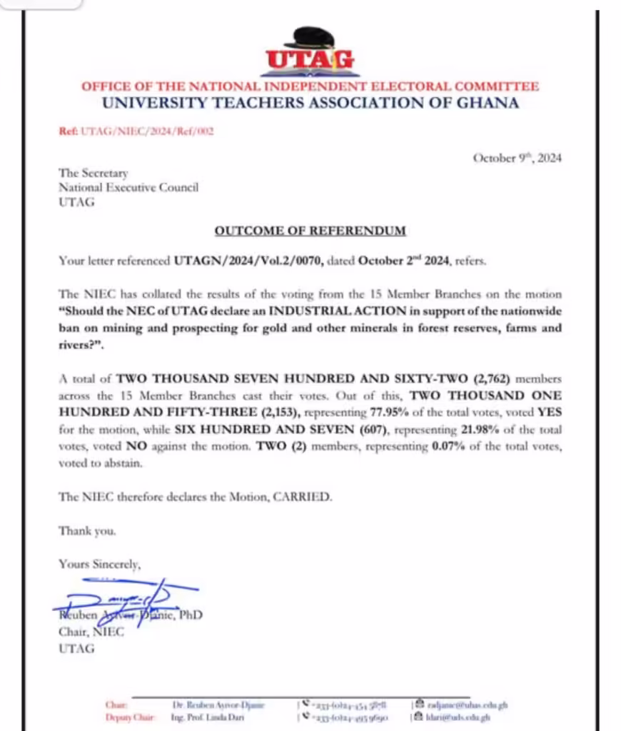 Following the referendum, the NEC convened an emergency meeting, invoking Article XIX, Clause 5 of the UTAG Constitution. In line with this constitutional mandate, NEC has unanimously declared an immediate INDEFINITE STRIKE from the 10th of October 2024 across all 15 UTAG branches. All members are directed to comply with this decision until the government formally announces a nationwide ban on mining and prospecting activities in protected areas, including forest reserves, farmlands, and water.”