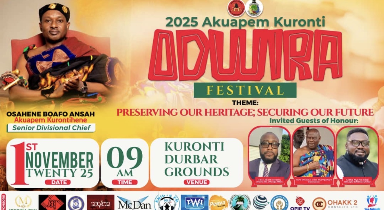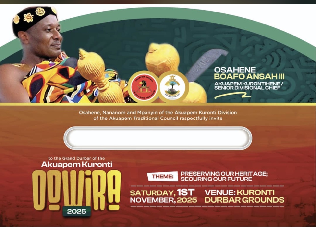 The Akuapem Kuronti Division of the Akuapem Traditional Council is set to celebrate this year’s much-anticipated Odwira Festival under the theme “Preserving Our Heritage; Securing Our Future.” The grand durbar will be held on Saturday, November 1, 2025, at the Kuronti Durbar Grounds, under the distinguished leadership of Osahene Boafo Ansah III, Akuapem Kurontihene and Senior Divisional Chief.