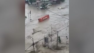 Videos show people sheltering on rooftops, while cars and shipping containers have been swept through the streets.