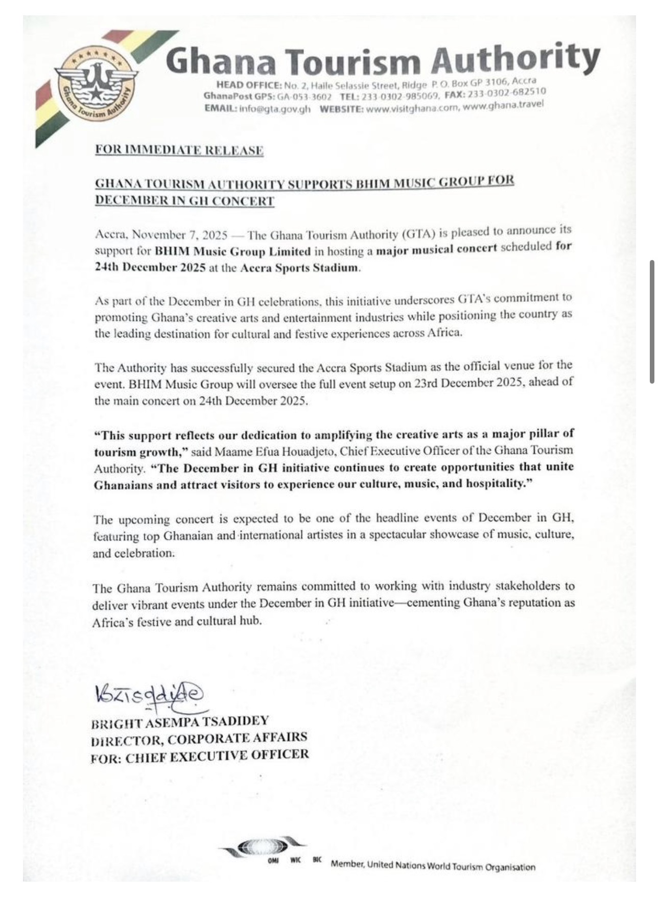 The Ghana Tourism Authority (GTA) has officially announced its support for BHIM Music Group Limited in hosting the highly anticipated BHIM Festival, now scheduled for December 24, 2025, at the Accra Sports Stadium.
